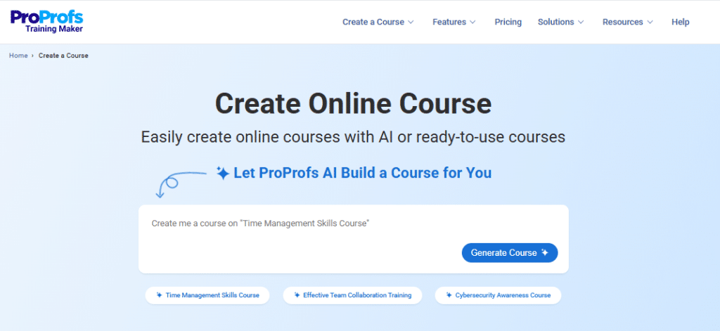 ProProfs Training Maker is a cloud-based LMS that offers a simple yet powerful way to create and manage courses for a wide range of users. One standout feature is its AI-powered course creation, which lets you quickly generate custom courses with a single prompt. This makes the process of building training programs much faster and less time-consuming.
